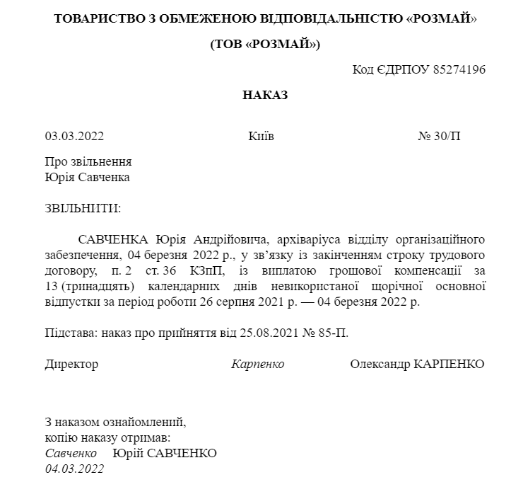 Наказ про звільнення працівника у зв’язку із закінченням строку трудового договору (п. 2 ст. 36 КЗпП)