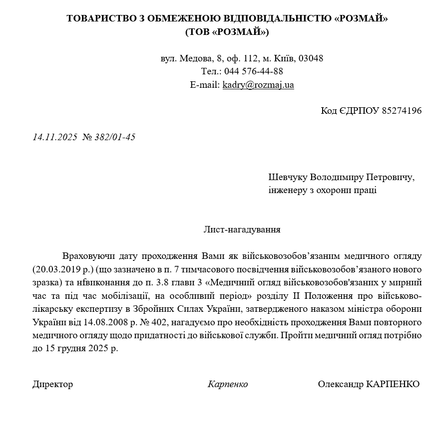 Лист-нагадування про необхідність пройти повторний медичний огляд ◦ Військовий облік. Військова служба 2007 28.10.2025