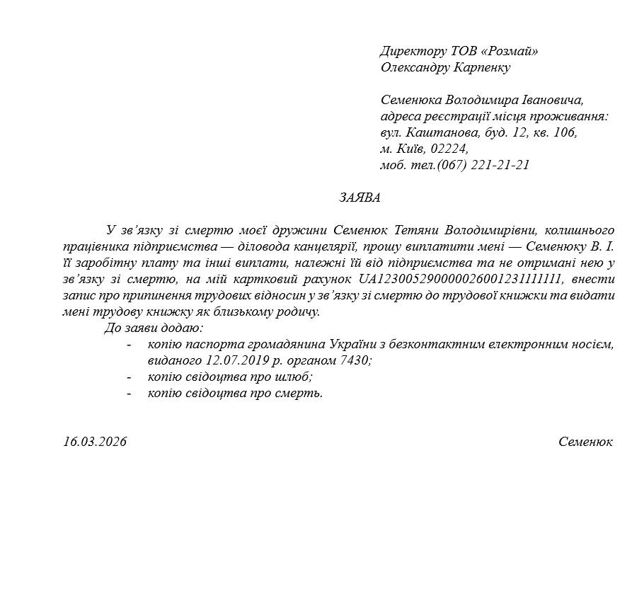 Заява родича померлого працівника про видачу його трудової книжки та отримання належних померлому коштів