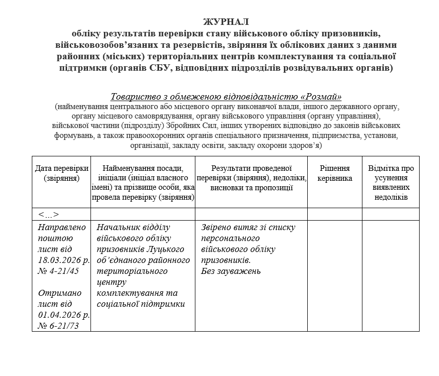 Зразок заповнення журналу обліку результатів перевірки стану військового обліку призовників, військовозобов’язаних та резервістів, звіряння їх облікових даних з даними ТЦК та СП