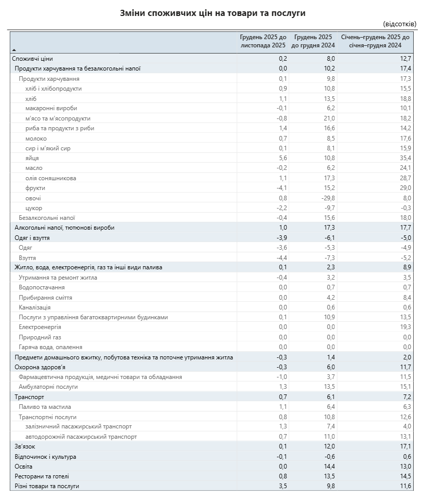 За даними Держстату, інфляція на споживчому ринку в грудні 2025 р. порівняно із листопадом становила 0,2 %, а з груднем 2024 р. – 8,0 %.