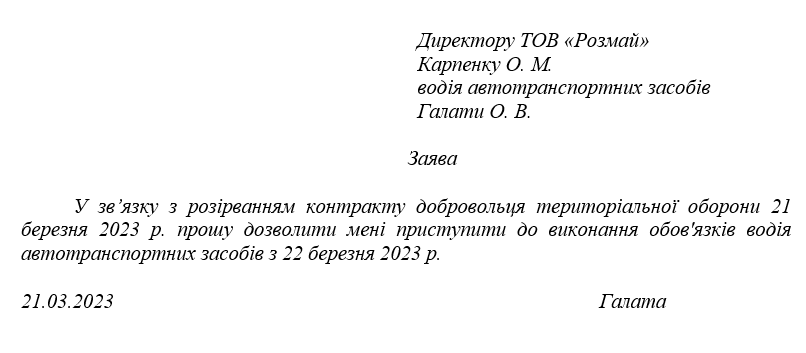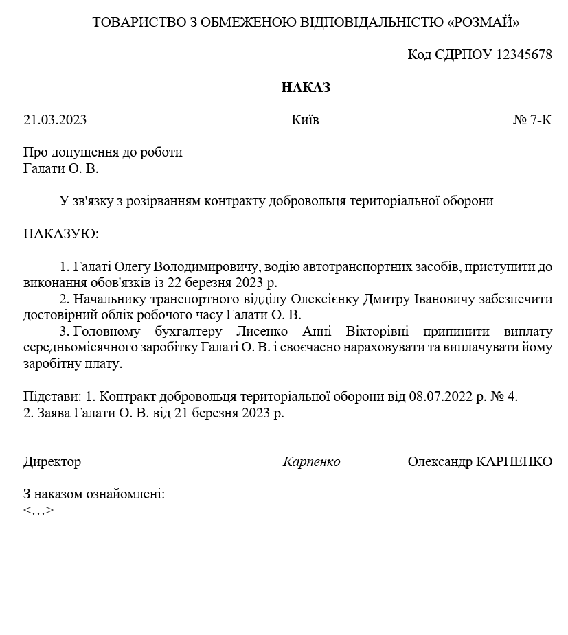 Працівник-доброволець тероборони, який розірвав контракт, повинен повідомити про це роботодавцю. Працівник заяву (додаток 4), в якій вказує про припинення дії контракту та бажання приступити до роботи, а також додає копію контракту. Своєю чергою, роботодавець видає наказ про допущення його до роботи (додаток 5), підставою якого є припинений контракт та заява працівника.