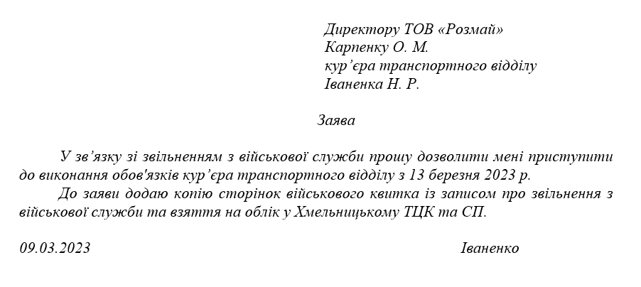 Бажання приступити до виконання трудових обов’язків за тією посадою (професією), яка зберігалася за працівником на весь період його перебування на військовій службі, він повинен викласти в заяві на ім’я роботодавця (додаток 1). До заяви необхідно додати копію сторінок військового квитка із записом про звільнення з військової служби.