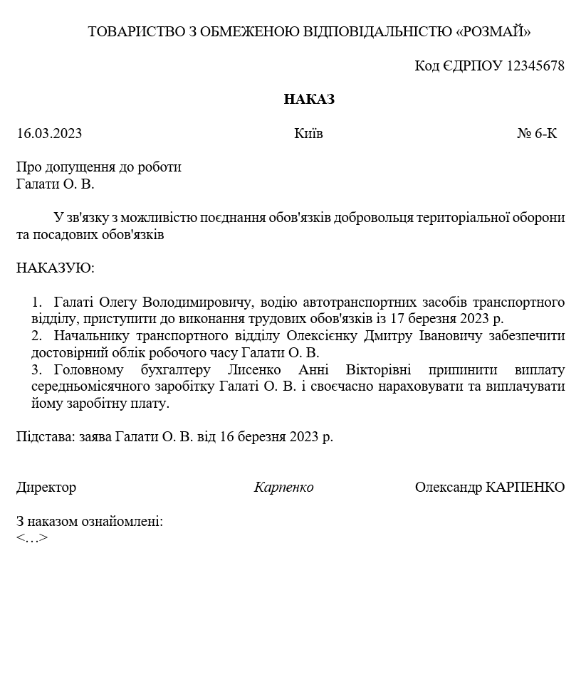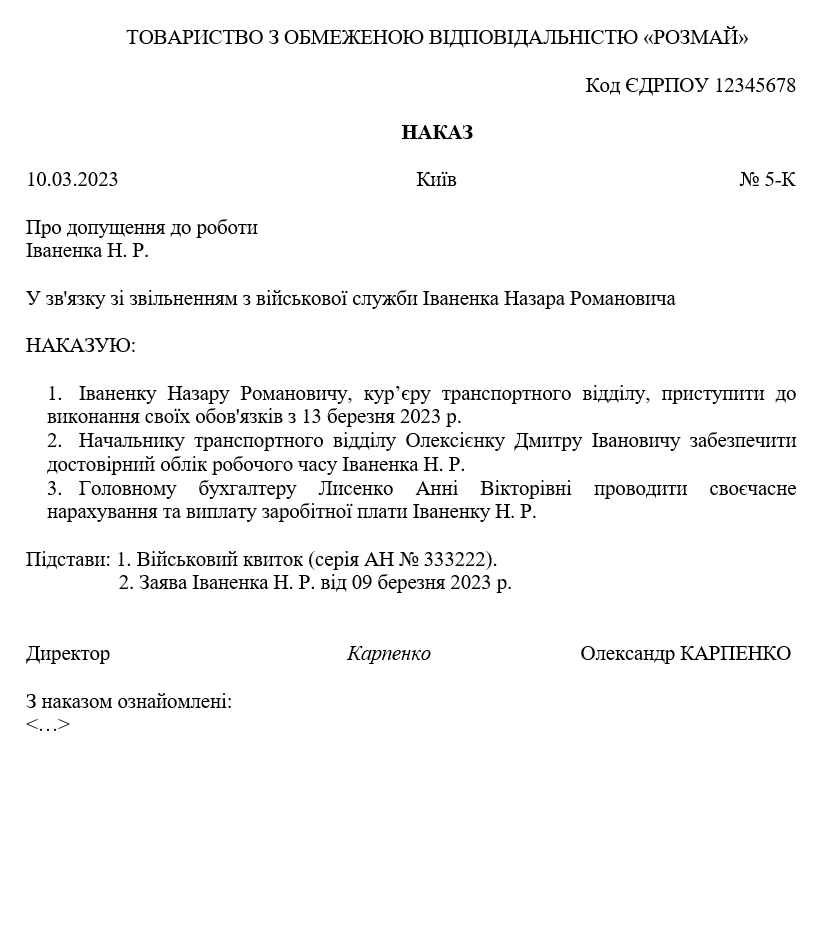 Працівник відділу кадрів готує наказ про допущення працівника до виконання його обов’язків (додаток 2). Наказ підписує керівник підприємства, працівник, який приступає до виконання своїх трудових обов’язків, представник бухгалтерії та особа, яка відповідає за достовірний облік робочого часу працівників.