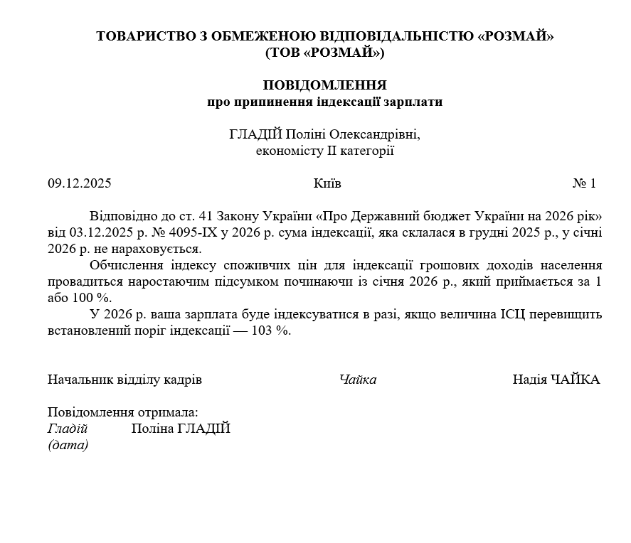 Та все ж вважаємо, що працівників варто попередити про припинення виплати індексації, яка склалася в грудні 2025 р. Попередження може бути: