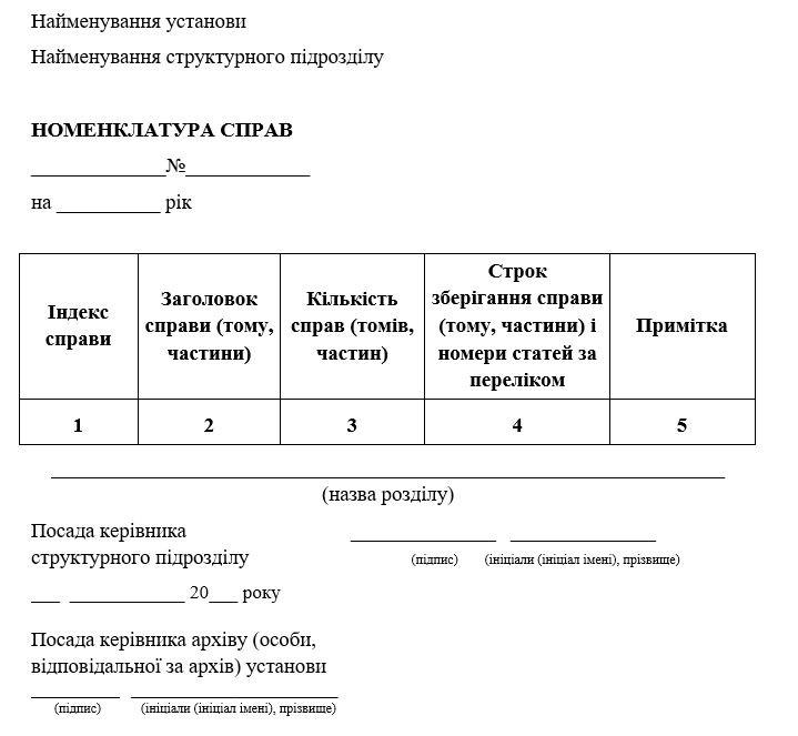 Уніфікована форма номенклатури справ структурного підрозділу