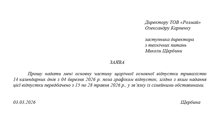 Заява про надання щорічної основної відпустки поза графіком ◦ Час відпочинку ◦ Відпустки ◦ Щорічна основна відпустка ◦ Кадрове діловодство ◦ Графік відпусток 632 03.03.2026