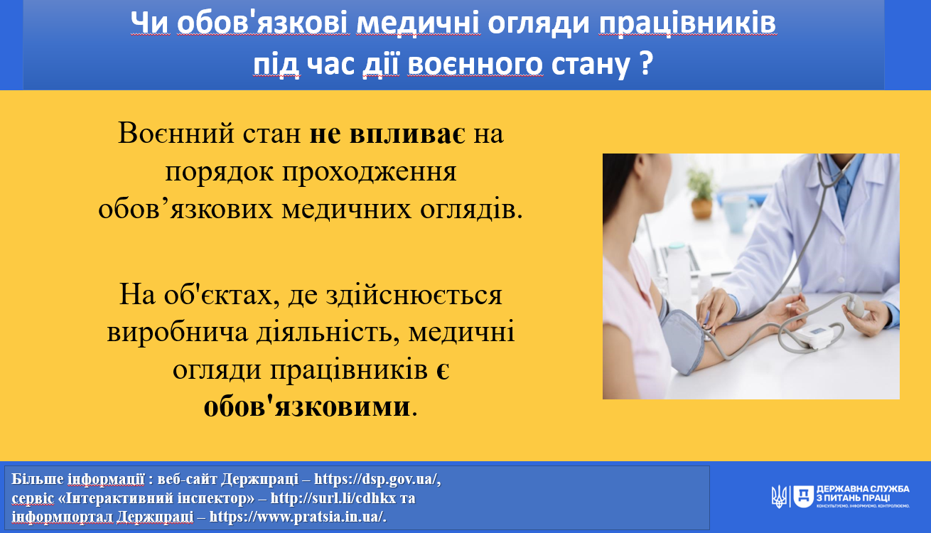 Фахівці Держпраці роз'яснюють, чи можна на період дії воєнного стану перенести строки проведення медичного огляду працівників або допустити до роботи працівника, який медогляд не пройшов.