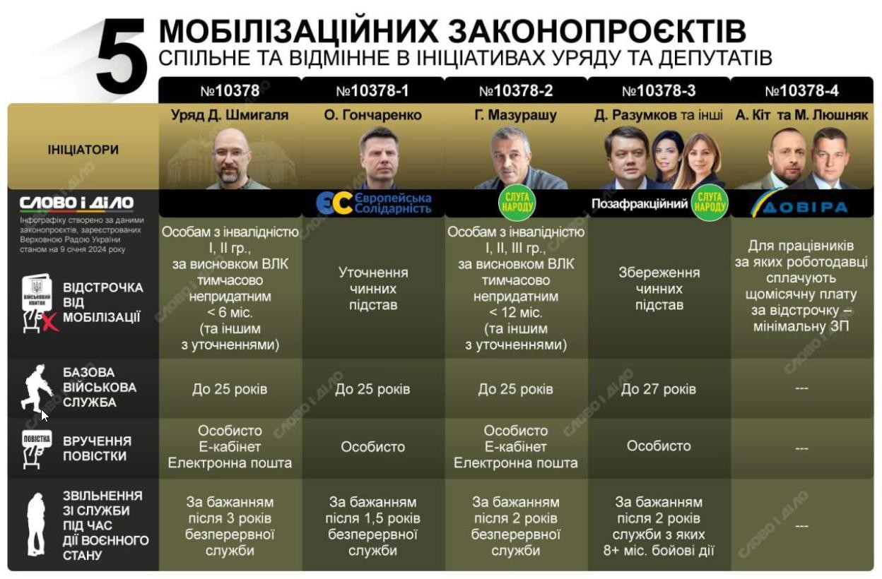Наприкінці минулого року у Верховній Раді було зареєстровано урядовий законопроєкт № 10378, який покликаний суттєво змінити правила мобілізації та проходження військової служби. Пізніше було зареєстровано ще чотири альтернативні проєкти — № 10378-1, № 10378-2, № 10378-3 і № 10378-4. Зараз усі вони проходять розгляд та обговорення у парламентських комітетах. Тож слідкуємо за перебігом обговорень та чекаємо на їх результат.