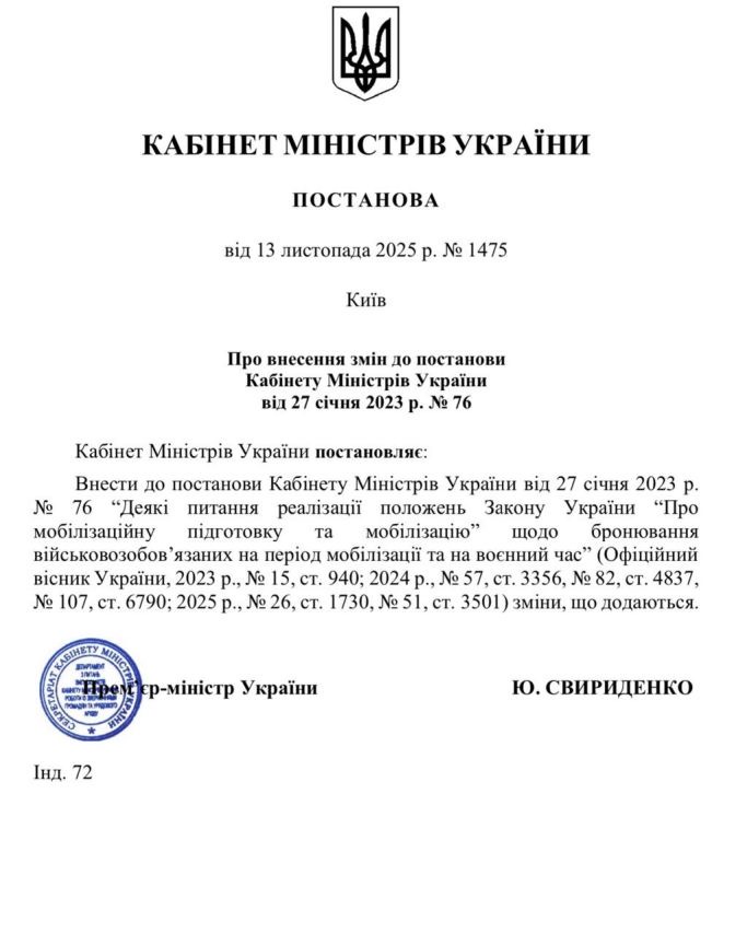 Постановою КМУ від 13.11.2025 р. № 1475 внесено зміни до Постанови № 76 щодо бронювання працівників.