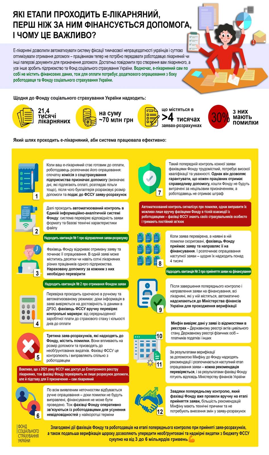 У інфографіці розповідаємо, які саме етапи проходить е-лікарняний, перш ніж за ним фінансується допомога, як відбувається перевірка фахівцями Фонду та верифікація кожної виплати.