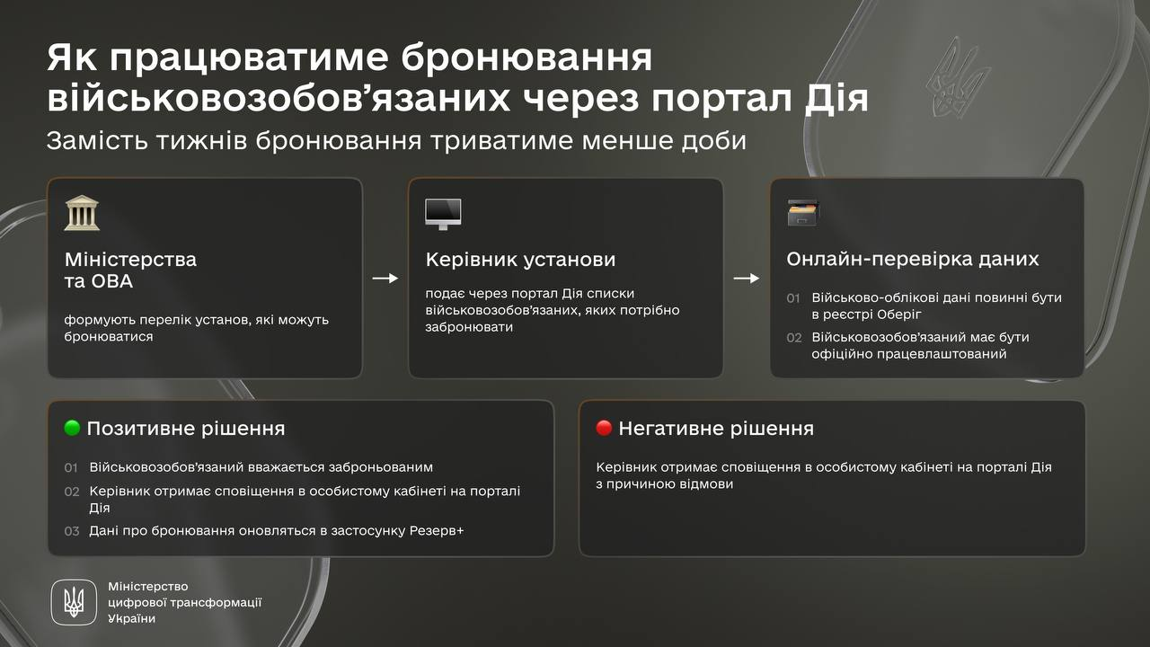 7 червня КМУ ухвалив постанову про цифровізацію бронювання (постанова № 650). Мінцифри повідомило, що розробляє послугу, щоб важливі для економіки компанії могли забронювати працівників на порталі "Дія". Послуга в "Дії" усуне людський фактор та пришвидшить процес до години. Рішення з бронювання прийматиме не людина, а кілька автоматичних перевірок у реєстрах.