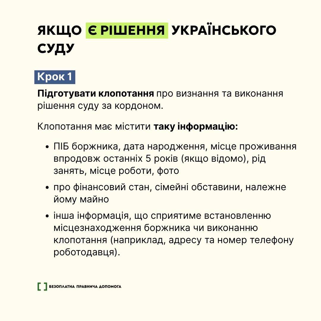 - подати позов до суду в Україні та отримати рішення про стягнення аліментів, а потім звернутися з цим рішенням до компетентного органу в іноземній країні для його визнання та виконання;