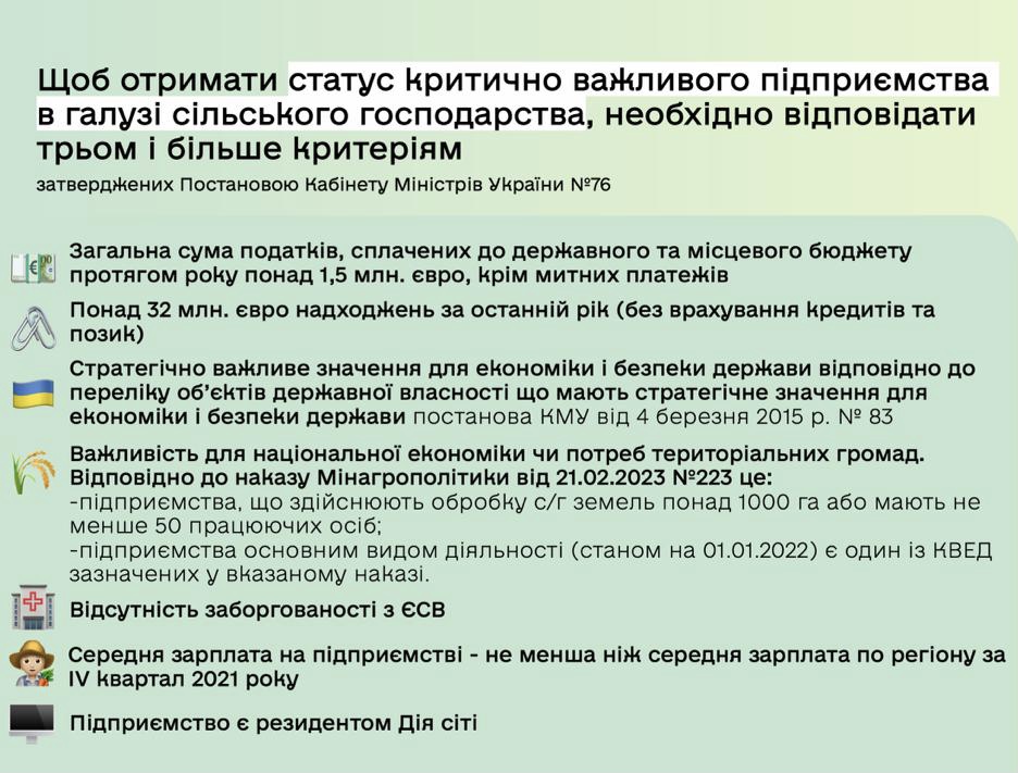 Відповідно до наказу Мінагрополітики “Про затвердження Критеріїв з визначення підприємств, установ та організацій, які мають важливе значення для національної економіки в галузі сільського господарства в особливий період” від 21.02.2023 р. № 223 визначено такі критерії: