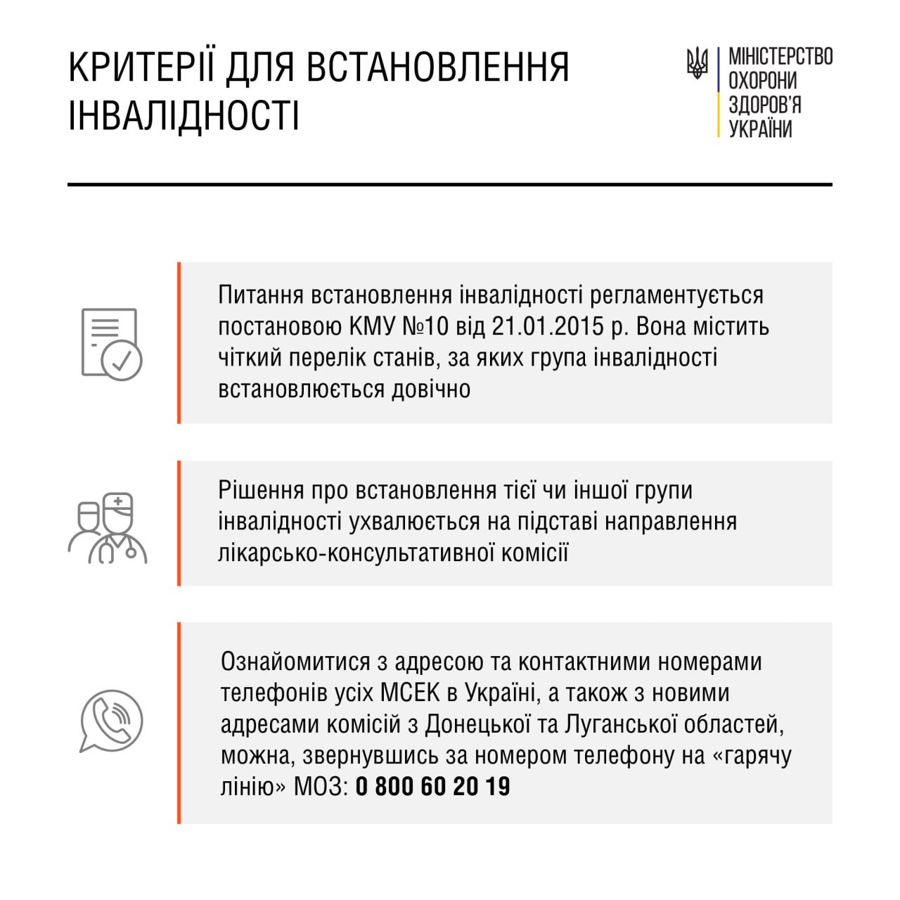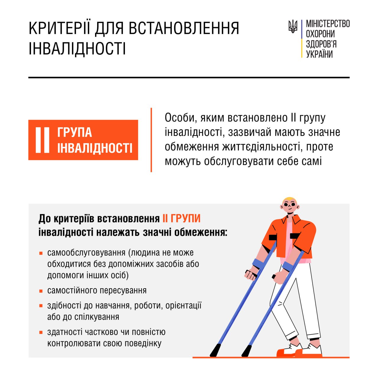 Фахівці МОЗ роз'яснюють, що I, II чи III групу інвалідності встановлюють з огляду на те, наскільки порушені функції органів і систем організму людини та обмежена її життєдіяльність. Порушення можуть бути спричинені захворюваннями, бути наслідком травм або уродженими вадами.