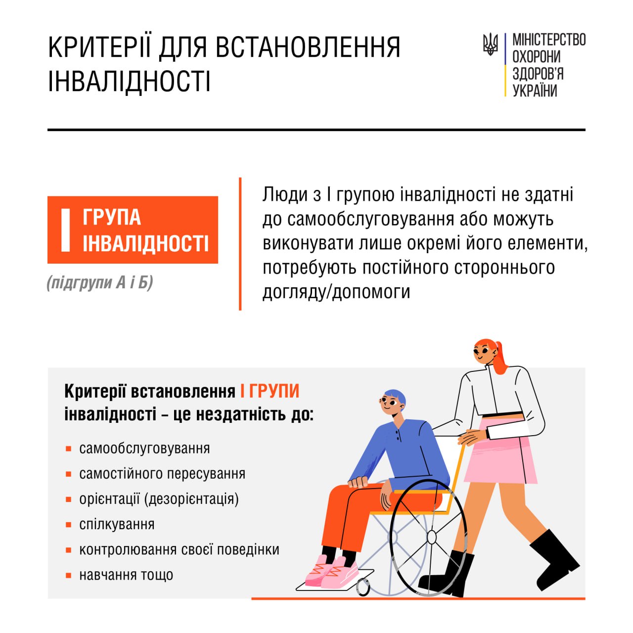 Люди з І групою інвалідності мають найважчий стан здоров’я: вони не здатні до самообслуговування або можуть виконувати лише окремі його елементи, потребують постійного стороннього нагляду/догляду/допомоги.