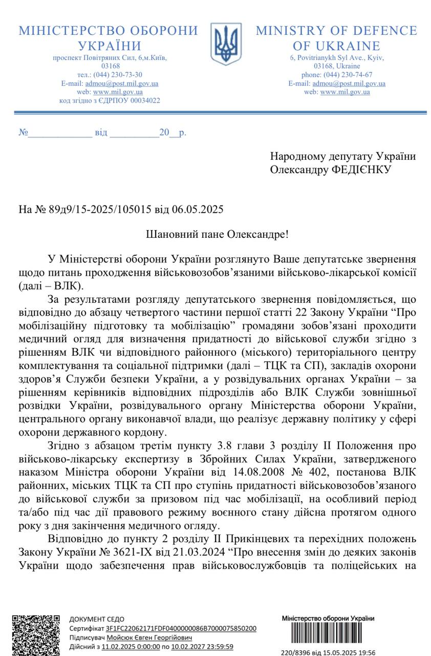 На запит народного депутата Олександра Федієнка Міноборони надало таке розʼяснення.