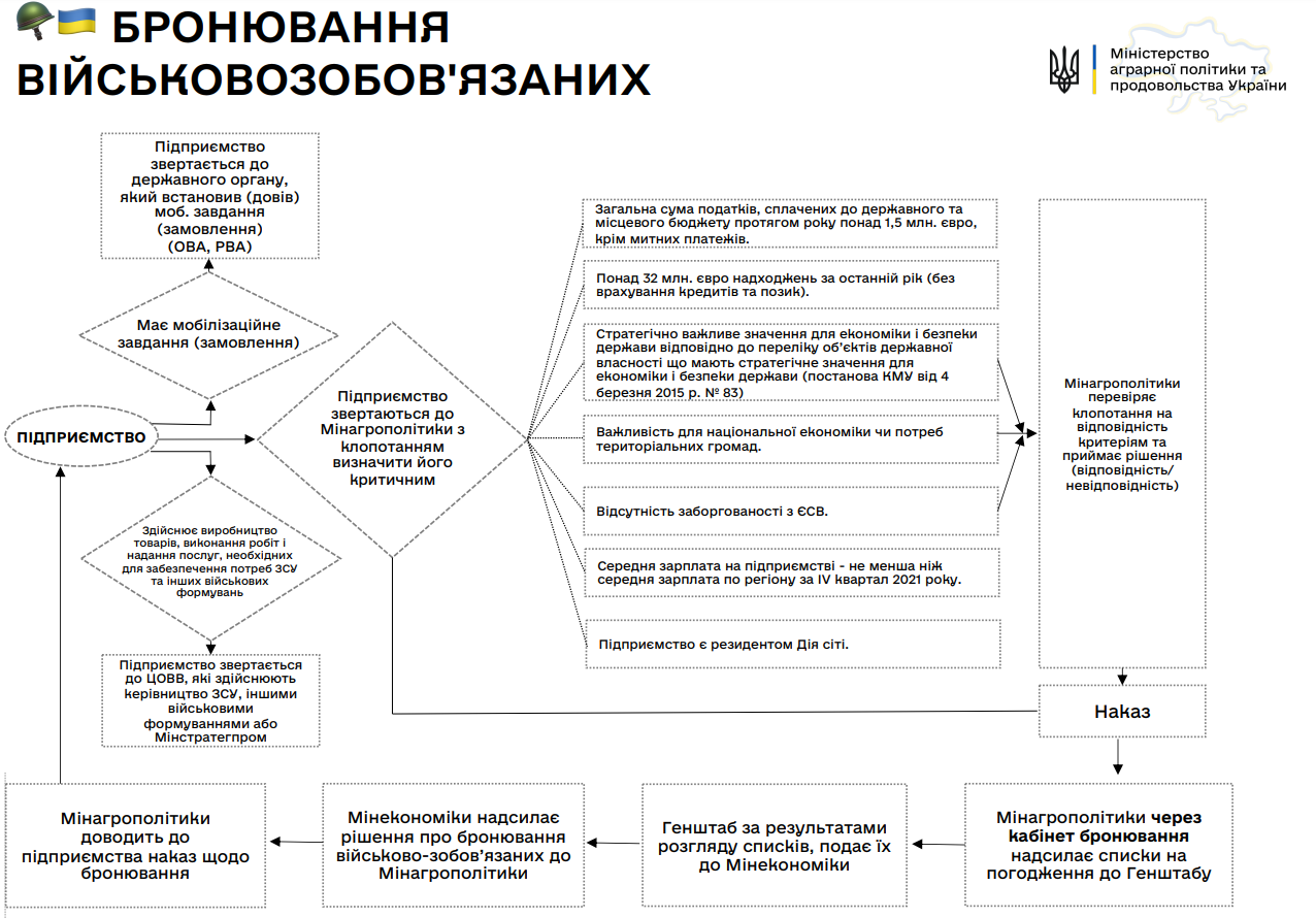 Для отримання статусу критично важливого підприємства, зокрема, й у галузі сільського господарства, необхідно відповідати трьом і більше критеріям, затвердженим постановою Кабінету Міністрів України № 76: