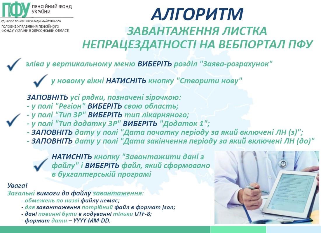 На вебпорталі ПФУ надана можливість в автоматичному режимі завантажувати листки непрацездатності, які сформовані в програмному забезпеченні ведення бухгалтерського обліку. Структуру файлу для завантаження розміщено на вебпорталі Пенсійного фонду України https://portal.pfu.gov.ua/ в кабінеті страхувальника в розділі "Заява-розрахунок".