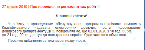 Кваліфікований надавач електронних довірчих послуг Інформаційно-довідкового департаменту ДПСУ повідомляє, що у зв’язку з проведенням обслуговування програмно-технічного комплексу 02.01.2020 р. з 18 год. 00 хв. до 21 год. 00 хв. доступ до електронних сервісів буде частково обмежено.