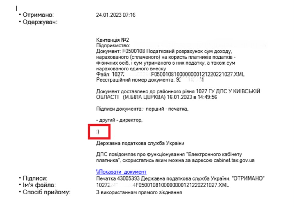 Останнім часом під час подання нової форми звітності J/F0500108 «Податковий розрахунок сум доходу, нарахованого (сплаченого) на користь платників податків – фізичних осіб, і сум утриманого з них податку, а також сум нарахованого єдиного внеску» за 4 квартал 2022 року деякі користувачі зіткнулися з проблемою тривалої обробки звітності у контролюючому органі та в подальшому отриманням квитанції №2, яка містить в тексті значення «:)».