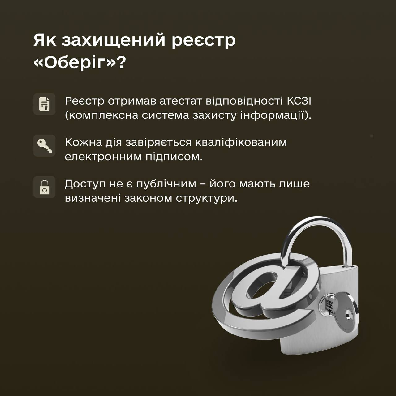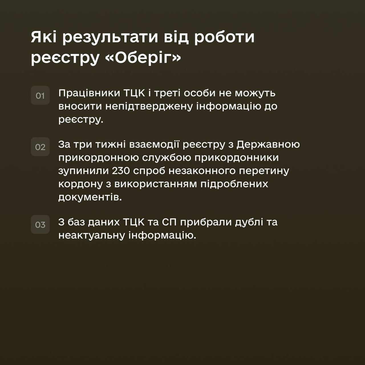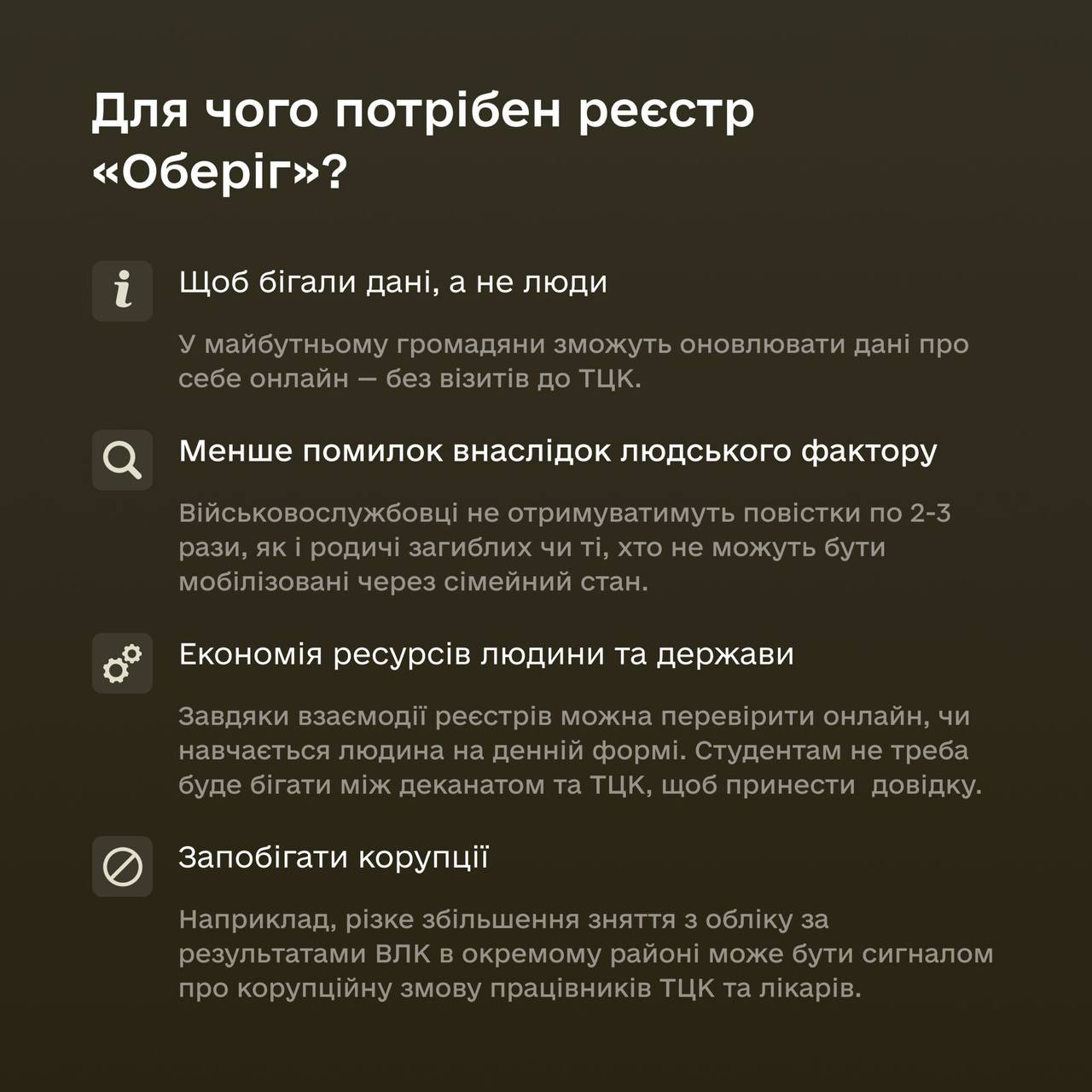 Єдиний електронний реєстр призовників, військовозобов'язаних та резервістів «Оберіг» – інструмент військового обліку громадян. Він має зменшити кількість помилок внаслідок людського чинника і заощадити ресурси держави й людини завдяки цифровізації. Окрема перевага — запобігання корупції. Завдяки реєстру кожен крок щодо зміни даних відслідковується та підтверджується електронним підписом.