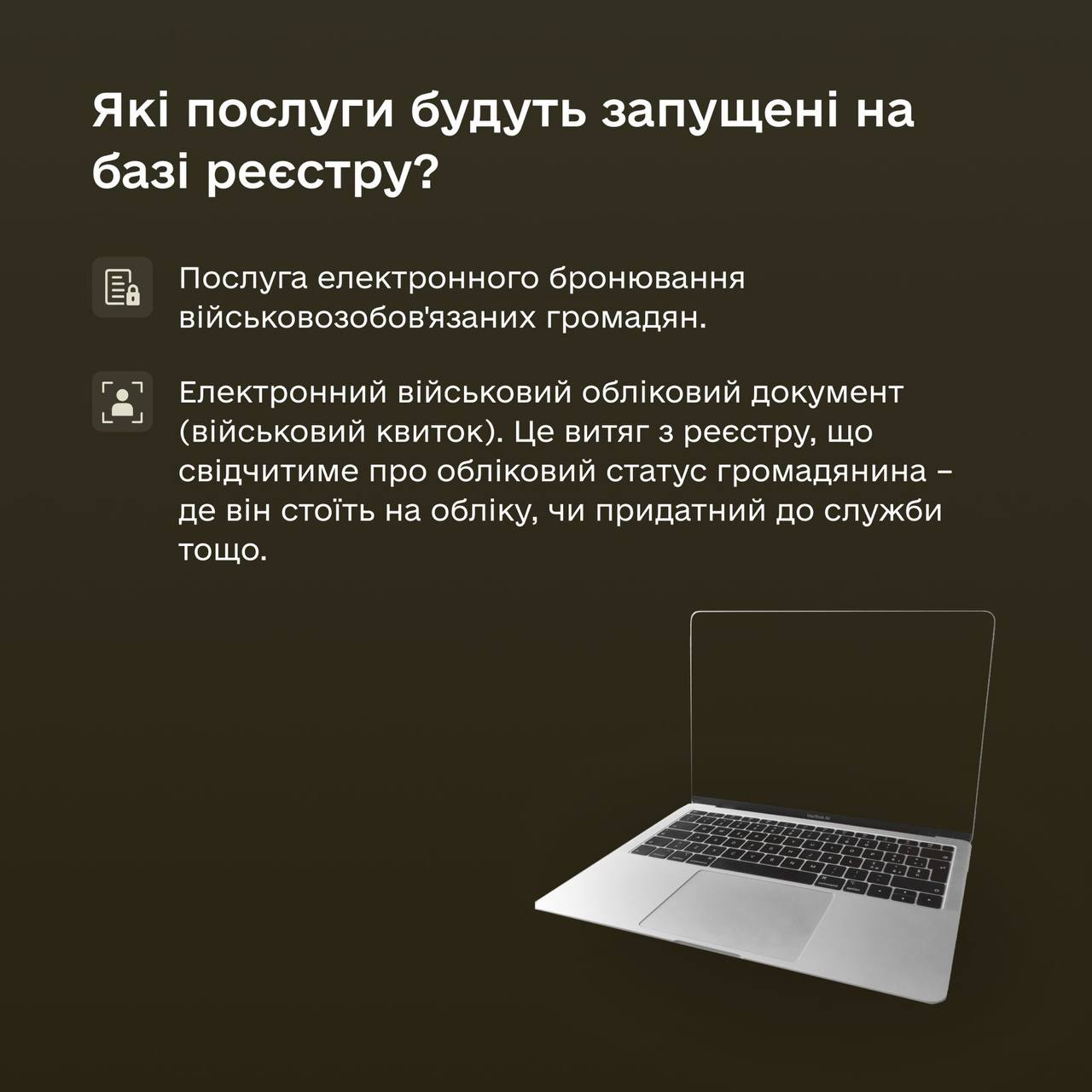 Зараз Міноборони разом з партнерами працює над створенням електронного військового облікового документа. Це витяг з реєстру, що свідчитиме про обліковий статус громадянина: де він стоїть на обліку, чи придатний до служби тощо.
