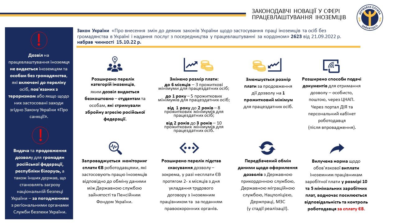 15 жовтня 2022 р. набув чинності Закон України «Про внесення змін до деяких законів України щодо застосування праці іноземців та осіб без громадянства в Україні і надання послуг з посередництва у працевлаштуванні за кордоном» від 21.09.2022 р. № 2623-IX.Цим законом: