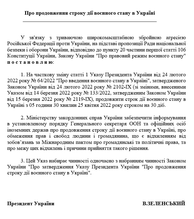 20 квітня на сайті Верховної Ради з'явився проєкт Закону, згідно з яким воєнний стан планується продовжити з 25 квітня строком на 30 діб, тобто до 25 травня.