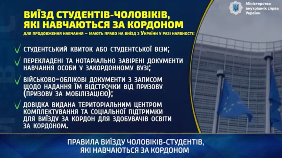Міністерство внутрішніх справ України інформує, що студенти-чоловіки, які навчаються за кордоном, але не змогли вчасно продовжити навчання через війну, мають право на виїзд.