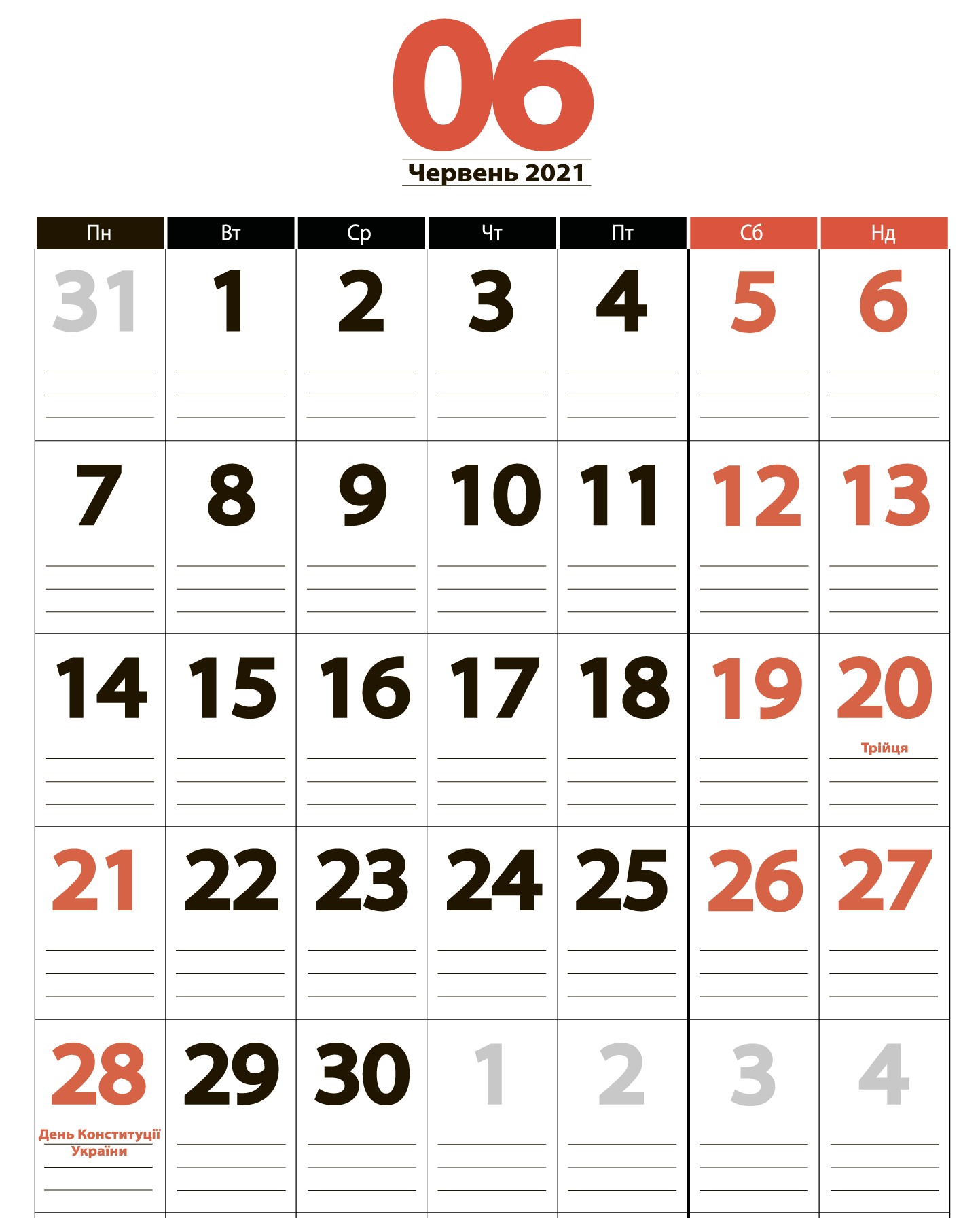 У червні 2021 року в Україні відзначаються два державні свята, у зв’язку з чим українці отримають додаткові вихідні дні. Так, 20 червня святкується Трійця, а 28 – День Конституції України.