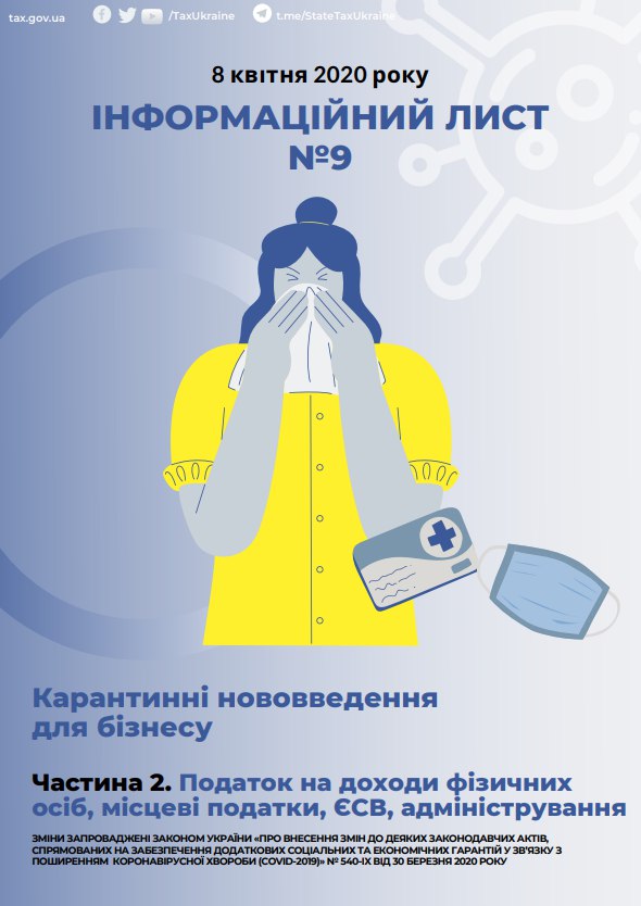 Державна податкова служба України в інформаційному листі № 9 роз’яснює нововведення, запровадженні Законом України «Про внесення змін до деяких законодавчих актів України, спрямованих на забезпечення додаткових соціальних та економічних гарантій у зв'язку з поширенням коронавірусної хвороби (COVID-19)» від 30.03.2020 № 540-IX (раніше законопроект № 3275) щодо податку на доходи фізичних осіб, плати за землю та нерухоме майно, а також щодо спрощеної системи оподаткування, обліку та звітності.