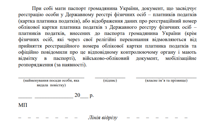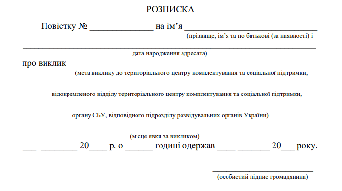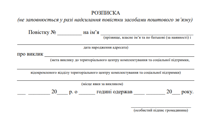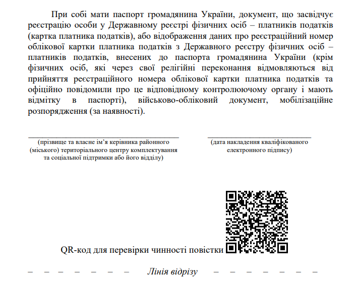 - прізвище та власне ім’я керівника районного (міського) ТЦК або його відділу, дата накладення кваліфікованого електронного підпису — для повісток, сформованих за допомогою Єдиного державного реєстру призовників, військовозобов’язаних та резервістів.