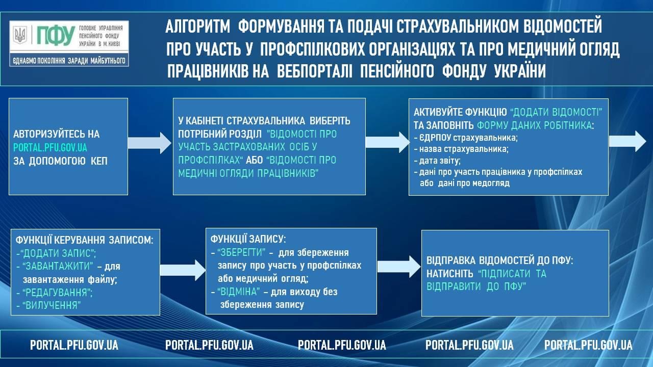 Алгоритм формування та подачі страхувальником відомостей про участь у профспілкових організаціях та про медичний огляд працівників на веб-порталі ПФУ